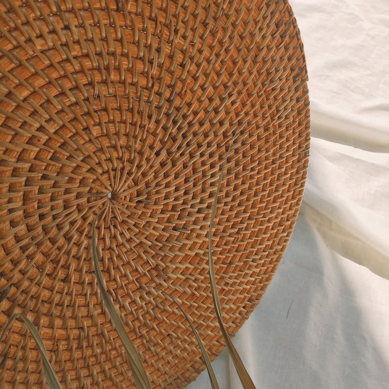 Perficap handmade rattan placemats kitchen placemats woven placemats heat resistant mats 4 pack natural round water hyacinth woven rattan placemat braided rattan tablemats 11.8 inch. This item may be discontinued or not carried in your add a sophisticated touch to your tablescape with the natural rattan placemat. Handcrafted of 100% rattan, our artesia natural placemat is woven in a pattern known as hapao. Round natural rattan placemats bowl pad insulation mats hot tea pots coasters. Color may vary slightly due to natural rattan material.